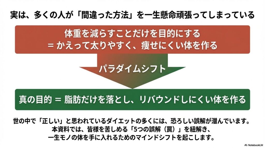 多くの人が陥る「数字の罠」を解き明かすために、なぜ「体重減少=成功」ではないのか、そのメカニズムを詳しく解説します。