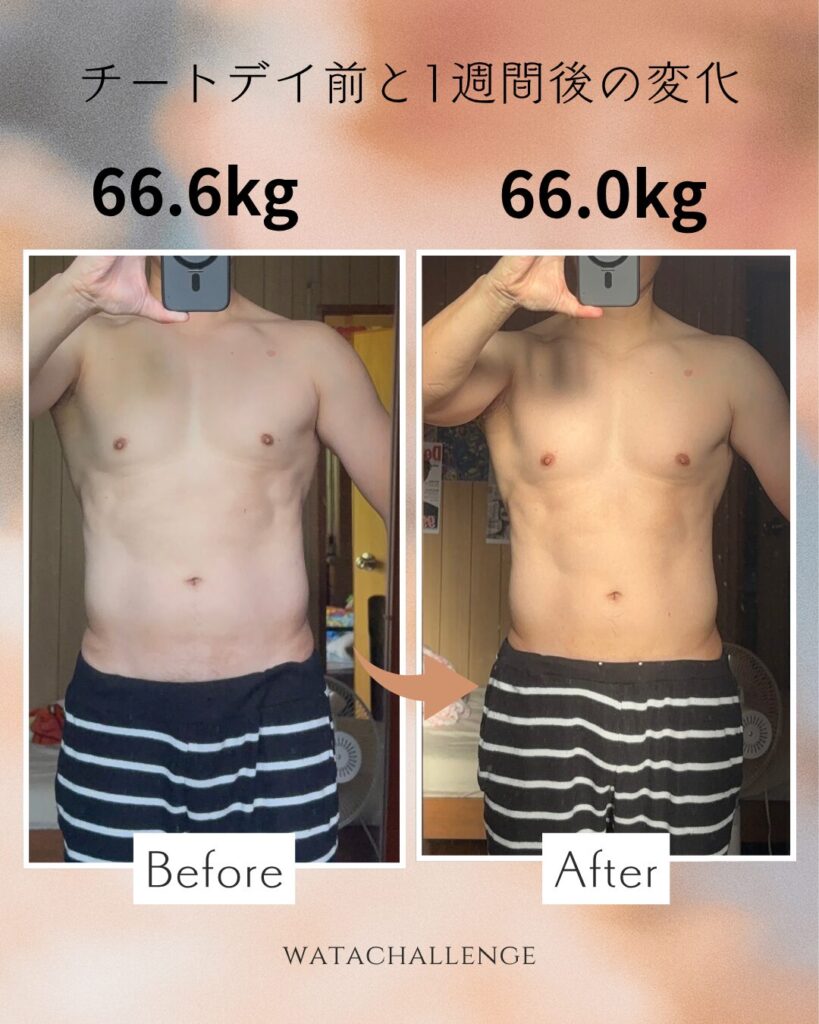 むしろ「体重をチートデイ前より減らしたい」という気持ちが強く、スムーズに切り替えられました。