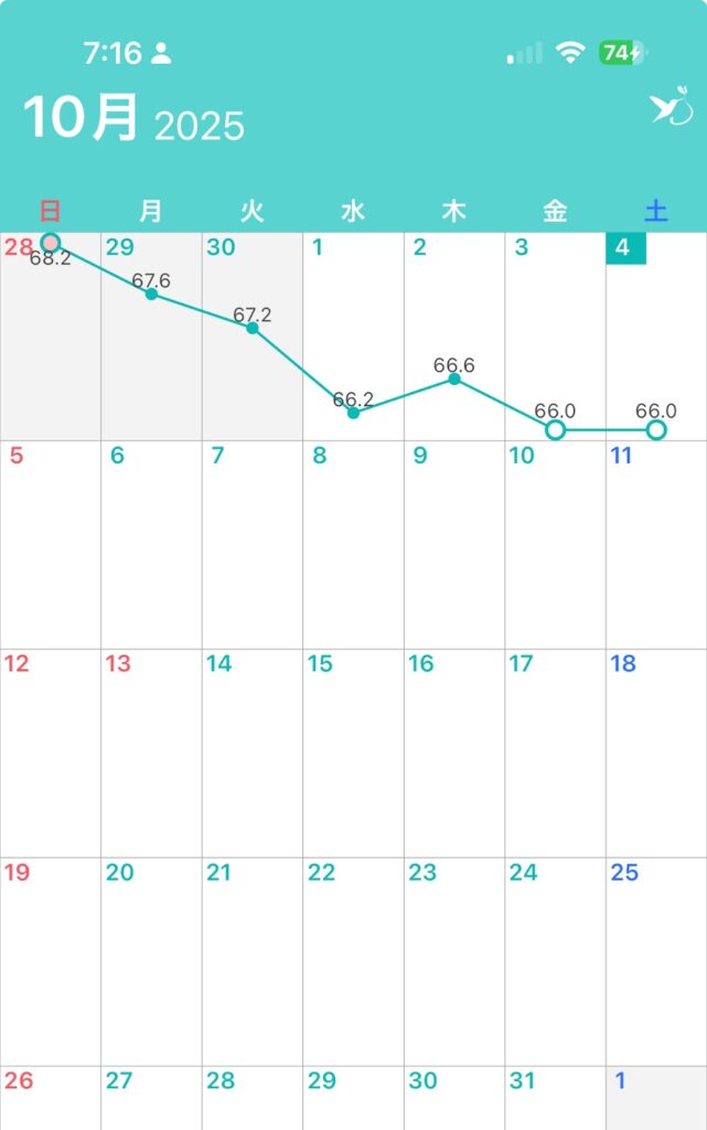 しかし、その翌日には67.6kg、さらに67.2kgと徐々に落ちていき、1週間後には66.0kgまで戻りました。
