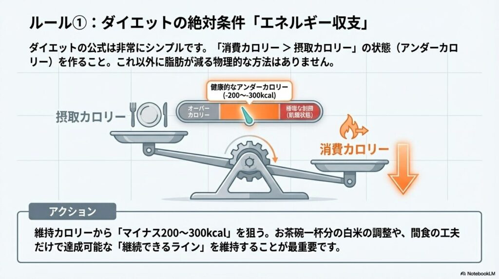 ダイエットを成功させるために、細かいテクニックよりも先に知っておくべき「絶対的なルール」があります。