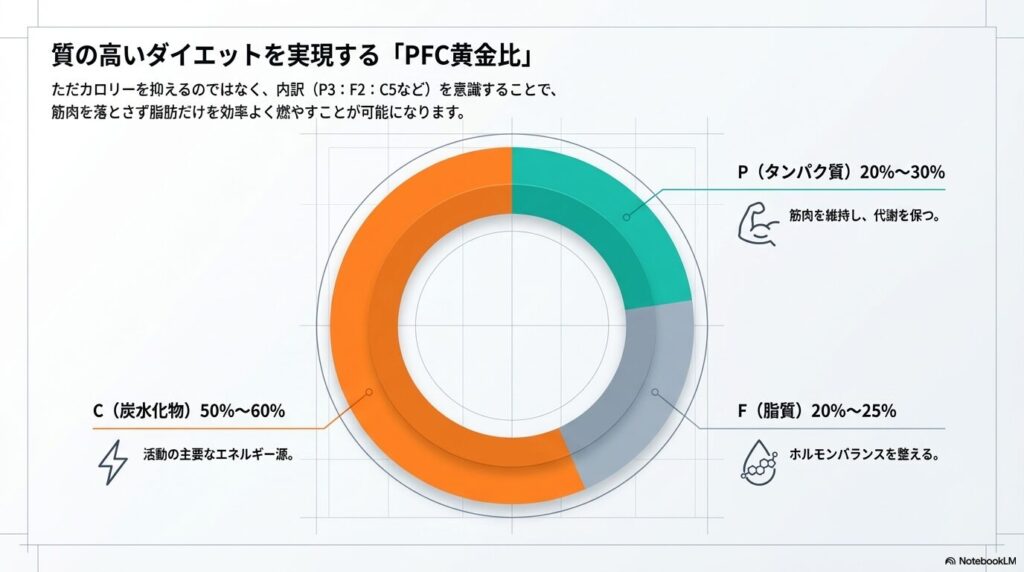 「なんとなく」という曖昧な感覚を排除し、データとして管理することで、ダイエットは「我慢」ではなく「パズルの調整」のような楽しさに変わります。 - PFCバランス(タンパク質・脂質・炭水化物)の黄金比ただカロリーを抑えるだけでなく、その「内訳」が重要です。