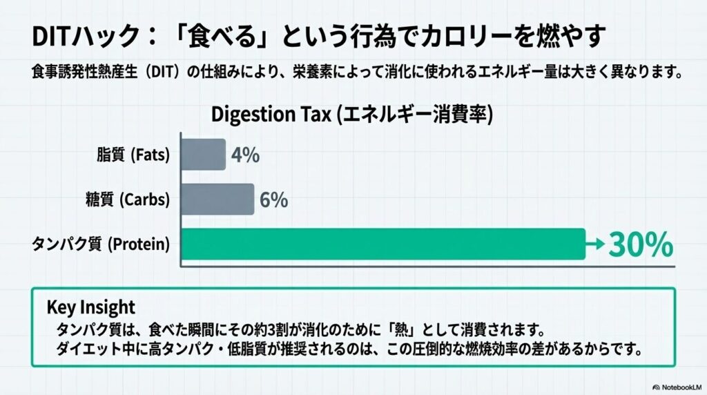 つまり、タンパク質を多く含む食事は、食べた瞬間にその約3割が消化のために「熱」として消費されるのです。