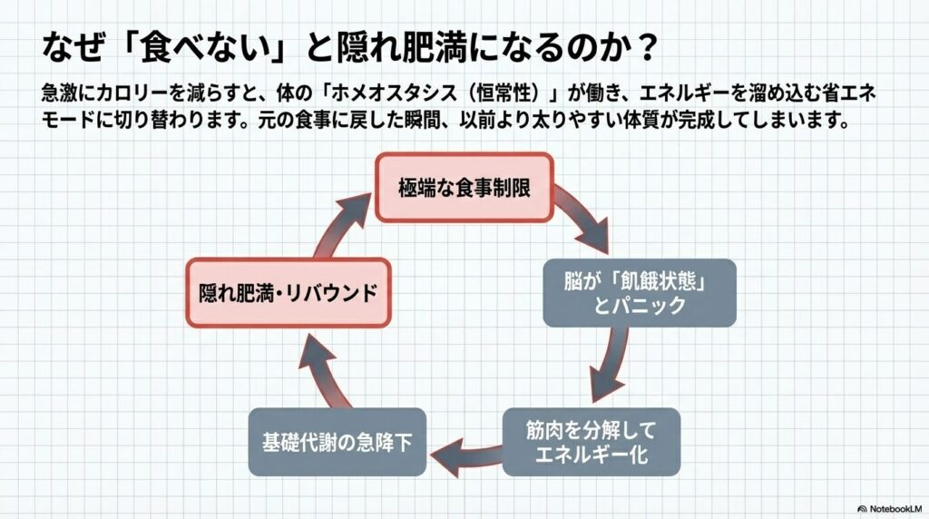 私たちの体には、環境の変化に対して状態を一定に保とうとする「ホメオスタシス(恒常性)」という機能があります。急激に摂取カロリーを減らすと、脳が「飢餓状態だ!」とパニックを起こし、エネルギーを溜め込みやすく、かつ燃やしにくい省エネモードに切り替わってしまいます。
