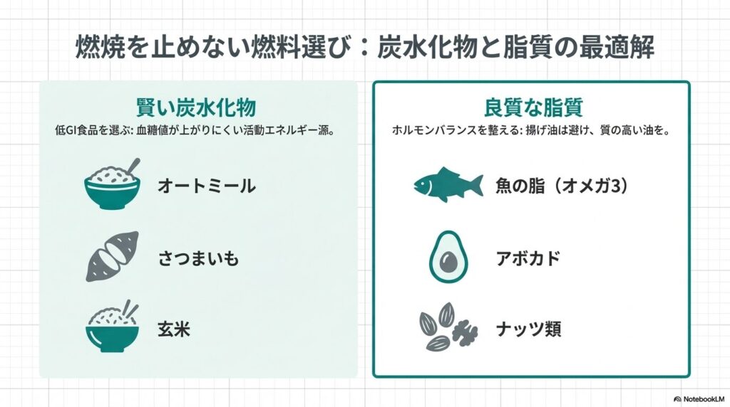 - 炭水化物: 完全に抜くのではなく、玄米、オートミール、さつまいもなど「低GI食品(血糖値が上がりにくいもの)」を選び、活動のエネルギー源として適切に摂取します。