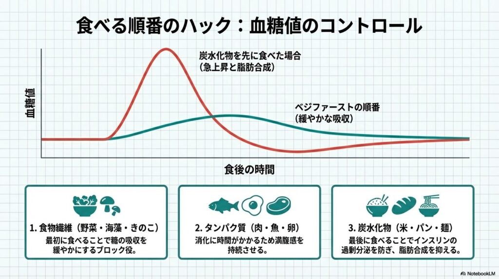 - 炭水化物(米・パン・麺): 最後に食べることで血糖値の急上昇(インスリンの過剰分泌)を抑え、脂肪合成を防ぎます。