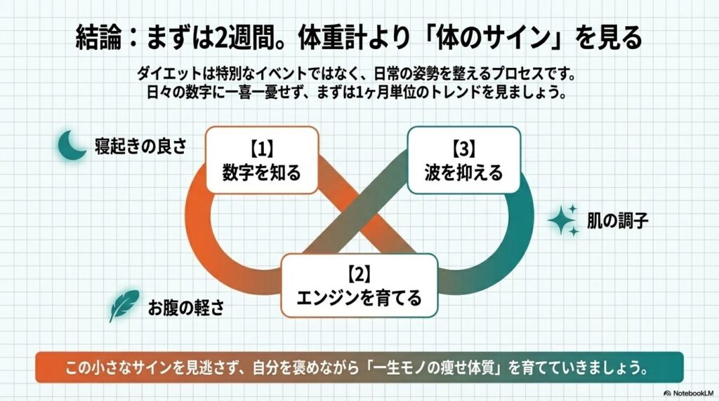 原理原則と代謝の仕組みを理解したところで、最後に「具体的に今日から何をすべきか」という実践的なステップを確認していきましょう。