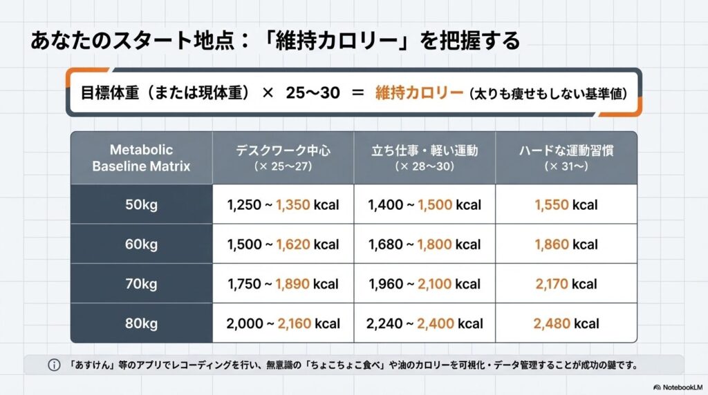 闇雲にカロリーを減らす前に、まずは「今の体重を維持するために必要なエネルギー(維持カロリー)」を把握しましょう。