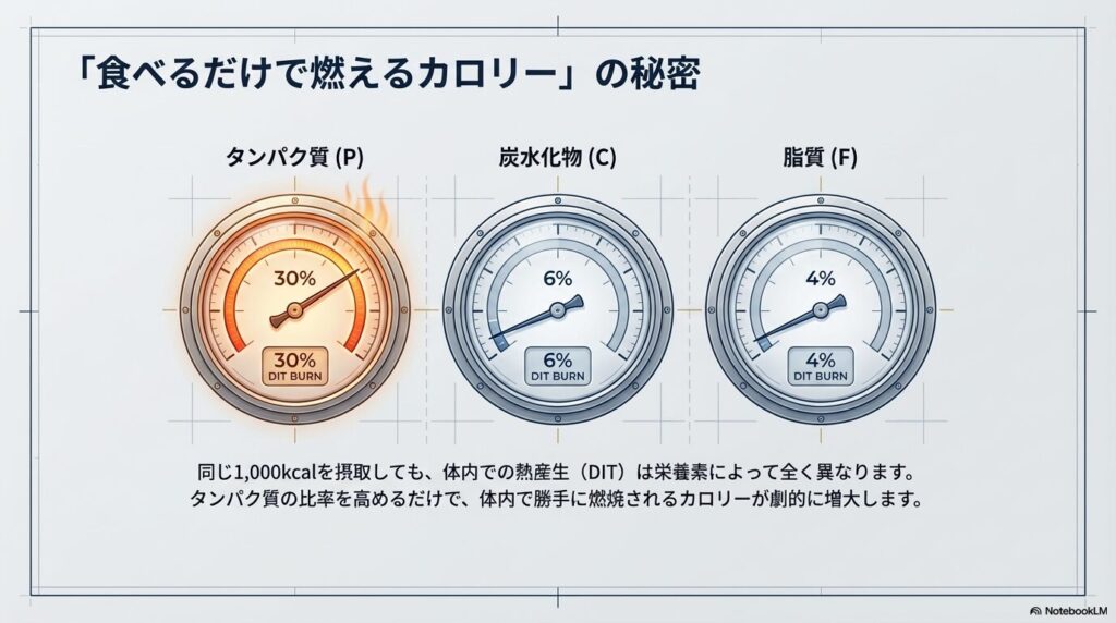 また、PFCバランスを整えることは、食事そのものによるエネルギー消費**「食事誘発性熱産生(DIT)」**を最大化することにもつながります。