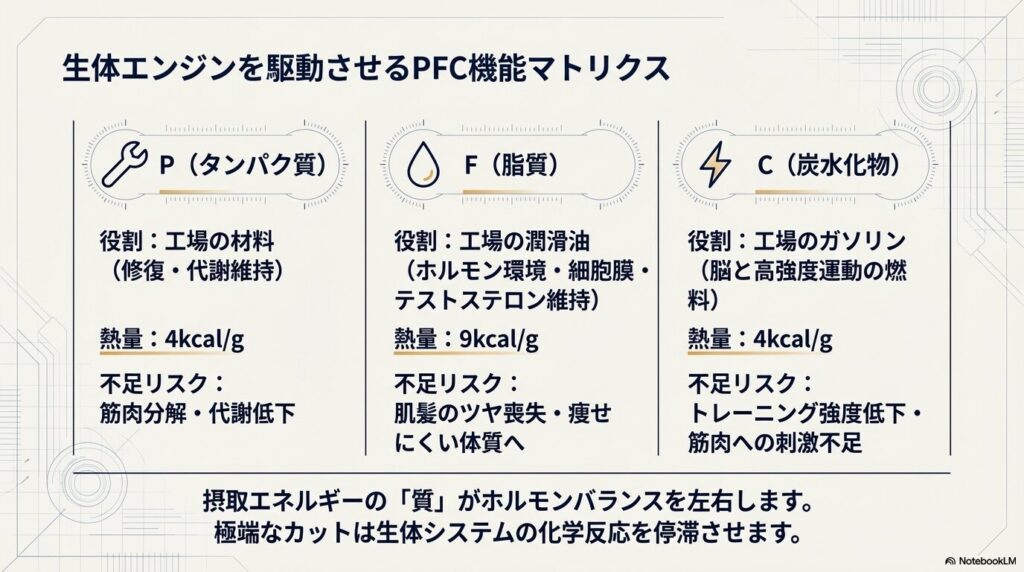 例えば「脂質(F)」は、ダイエットの敵と思われがちですが、細胞膜やホルモン(特に筋肉合成に関わるテストステロンの維持)の材料となる極めて重要な要素です。