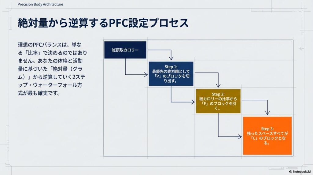 PFCバランスの算出は、単なる「比率」で決めるのではなく、あなたの体格と活動量に基づいた「絶対量」から逆算していくのが最も確実な方法です。