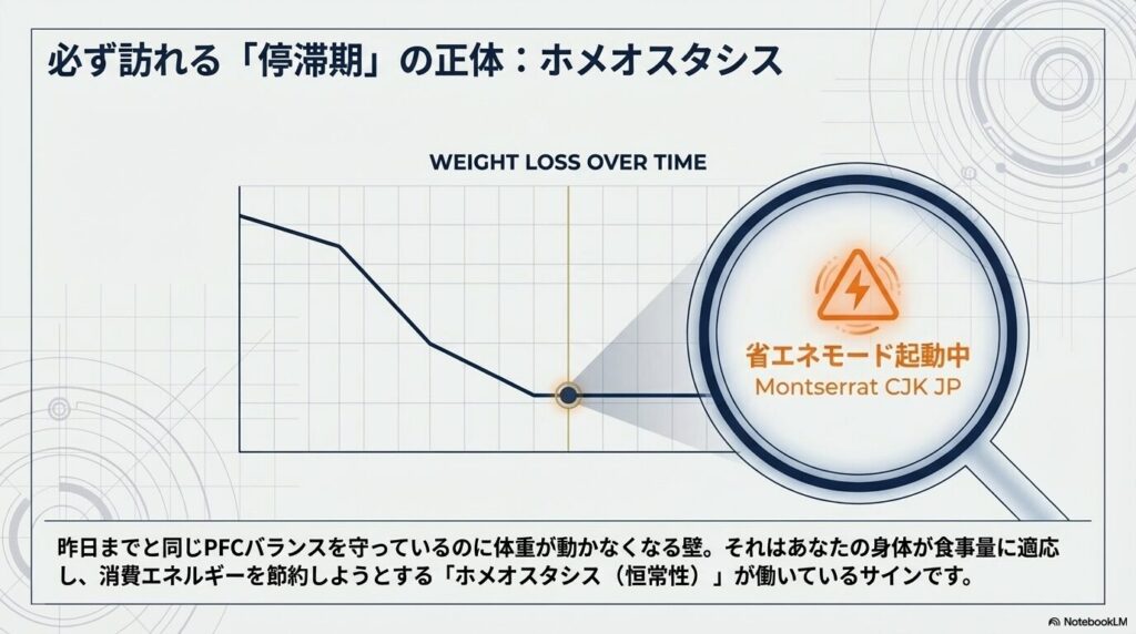 昨日までと同じPFCバランスを守っているのに、なぜか体重が動かなくなる。それは、あなたの身体がその食事量に適応し、消費エネルギーを節約しようとする「ホメオスタシス(恒常性)」が働いているサインかもしれません。