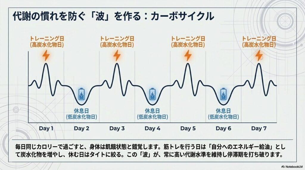 これを防ぐために有効なのが、炭水化物(C)の量に変化をつける**「カーボサイクル」**です。