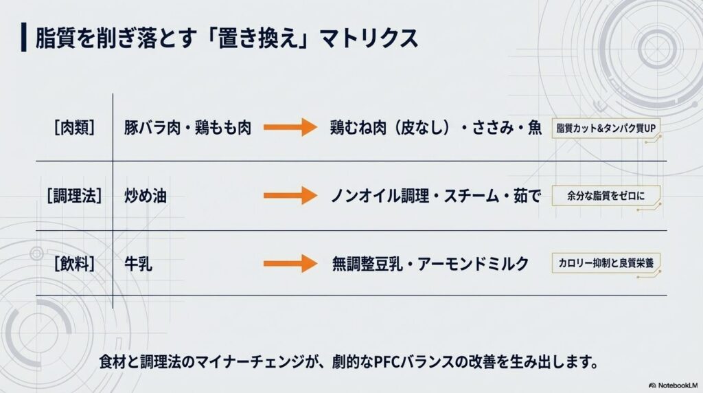| 豚バラ肉・鶏もも肉 | 鶏むね肉(皮なし)・ささみ・魚 | 脂質をカットし、タンパク質比率をアップ |